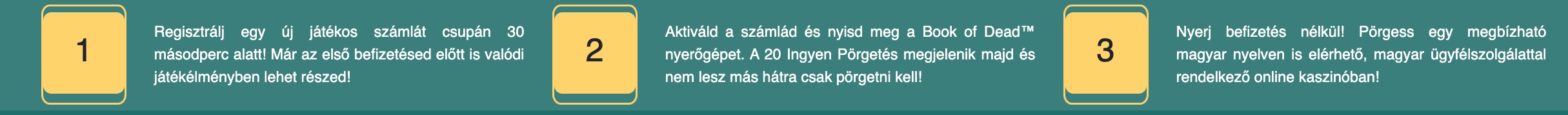 Az oldalon elérhető legtöbb játékot, az élő kaszinó játékok kivételével korlátlan számú alkalommal kipróbálhatod demó üzemmódban, játékpénzben, kockázatok nélkül. Ez remek alkalom a játékokkal való ismerkedésre, különösen akkor, ha még kezdőnek tartod magad, vagy először próbálod ki, hogyan működik egy magyar online kaszinó felülete valódi pénz nélkül. A valódi pénzes játékhoz viszont mindenképp megerősített felhasználóra lesz szükséged, azonban ez csupán 3 perced fog elvenni az idődből. Akár most azonnal regisztrálhatsz és részesülhetsz az akár 120,000 HUF értékű üdvözlő bónuszban és az új játékosoknak szóló 100 ingyenes pörgetésben! A regisztrációhoz egyszerűen klikkelj az oldal jobb felső részén található narancssárga “regisztráció” gombra.