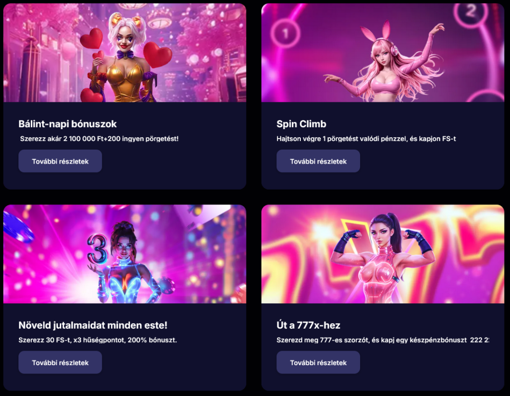 A felület kifejezetten nyitott a magyar közönség felé, amit a magyar nyelvű felület és a forint alapú pénzügyi tranzakciók támogatása is bizonyít. A kínálat magas színvonalú, a klasszikus nyerőgépektől kezdve az élő osztós asztalokon át az azonnali játékokig minden megtalálható. Az oldal modern, egyszerű, és a helyi fizetési módok elérhetőségével ideális választás lehet a hazai játékosoknak.