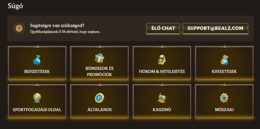 - Realz nyerőgépek. Több ezer játék, számos változatban: klasszikus, megaways, bonus buy, stb.