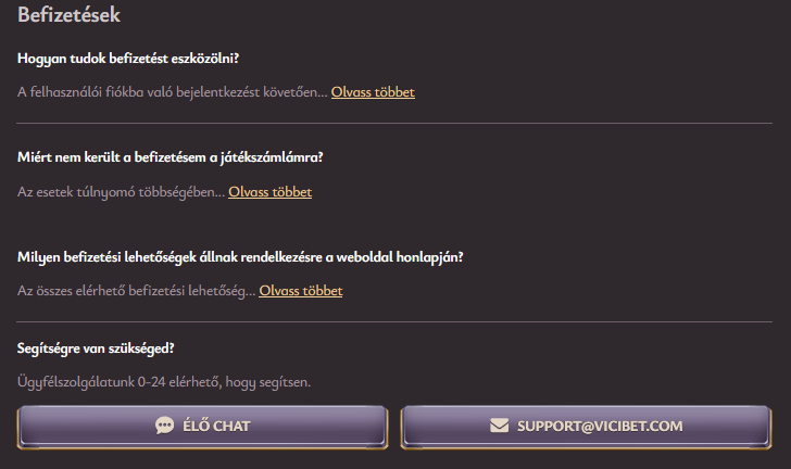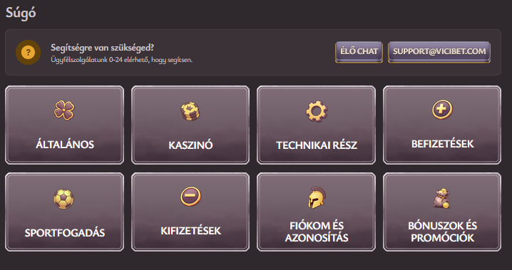 A Vicibet ügyfélszolgálata elsősorban angol nyelven működik, azonban bizonyos esetekben magyar nyelvű segítség is elérhető. Tapasztalataink szerint az élő chat gyors és rugalmas, így angol nyelven is hatékony az ügyintézés. Összetettebb ügyeknél az emailes kapcsolatfelvétel javasolt, ahol több idő jut a részletek tisztázására.