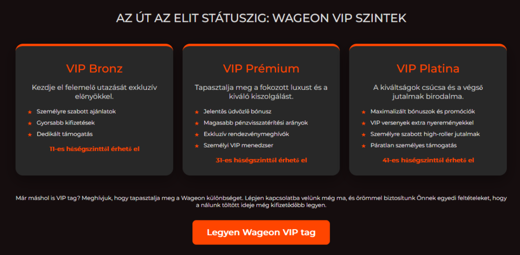 A Wageon VIP program nem egy egyszeri nagy befizetéshez kötődik, hanem a felhasználó hosszabb távú aktivitása alapján épül fel. A rendszer ötven szintből áll, és az előrelépés a játék során gyűjtött pontokhoz, valamint a rendszeres részvételhez kapcsolódik. Tapasztalataink szerint ez kiszámíthatóbb működést ad, mivel a státusz nem véletlenszerű, hanem következetes használattal érhető el.