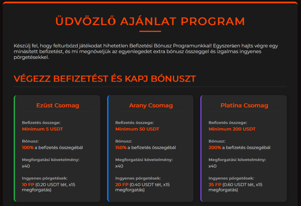 A belépő szint az Ezüst csomag, ahol minimum 5 USDT befizetés szükséges, ezért 100% bónusz és 10 ingyenes pörgetés jár. Az Arany csomag 50 USDT befizetéstől érhető el, itt a bónusz mértéke 150%, míg a Platina csomag 200 USDT befizetés felett 200% extra egyenleget biztosít.