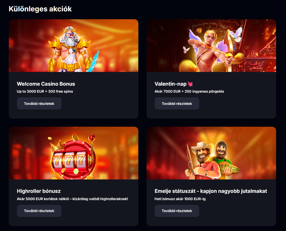 Az ajánlatoknak külön szabályaik vannak, tehát minden promónál eltérhet az érvényesség ideje, játékhozzájárulás feltételei és egyéb faktorok is. A platform többek között kaszinó üdvözlő bónuszzal is jutalmazza a játékosokat, de ezek komplex és feltételvezérelt ajánlatok amelyeket nem gyors kifizetésekre terveztek, hanem hosszú távra.